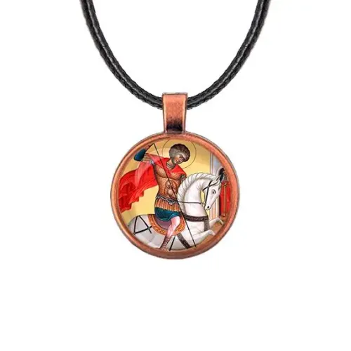 Кулон с изображением Георгия Победоносца — это не только стильный аксессуар, но и символ мужества и победы. Изготовленный из бижутерного сплава с покрытием под медь и стекла, он станет прекрасным дополнением к любому образу.