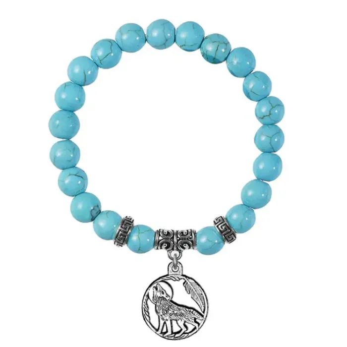 Браслет-амулет из синтетической бирюзы с подвеской в виде волка из бижутерного сплава.
