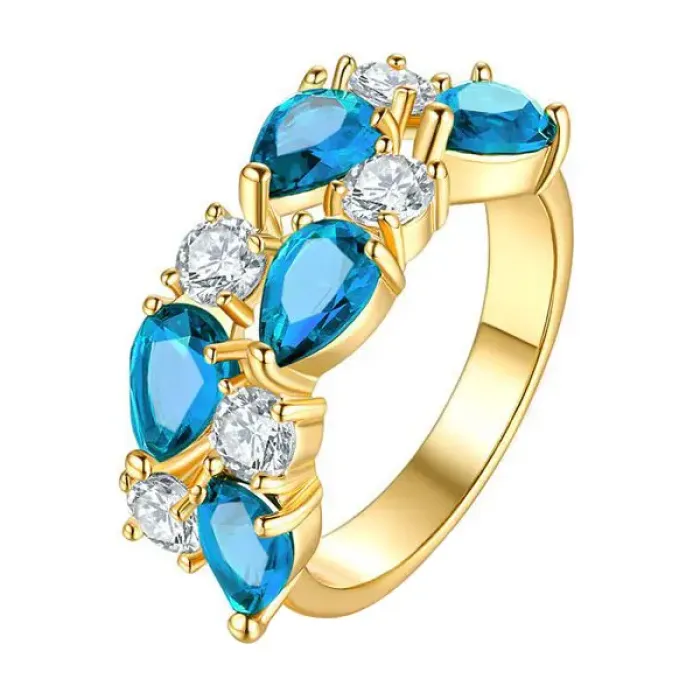 Бижутерное кольцо из сплава с позолотой и вставками из фианитов голубого цвета.