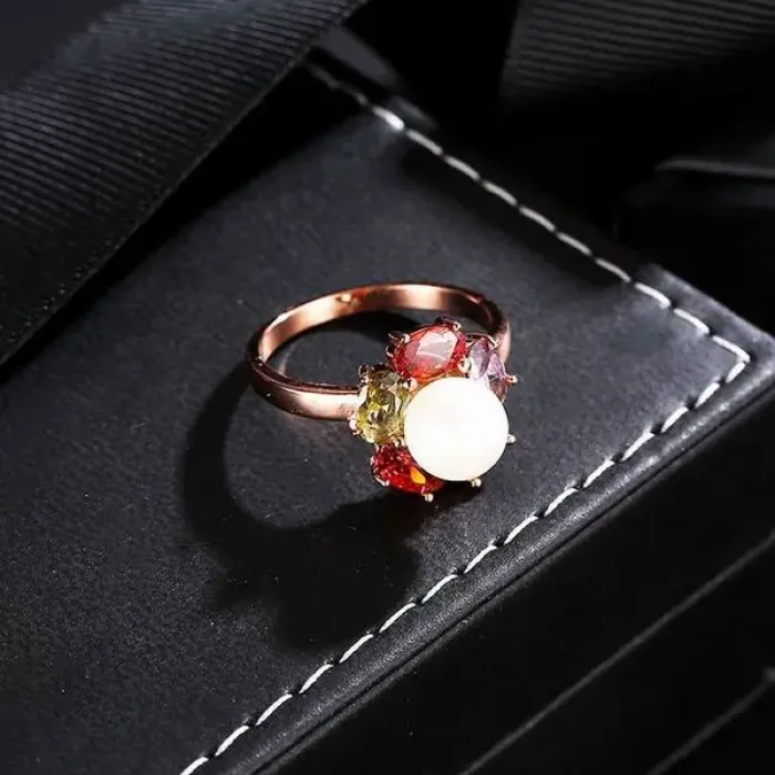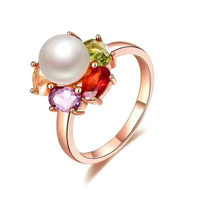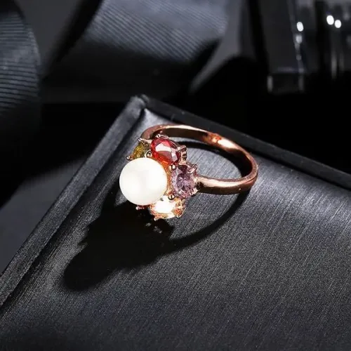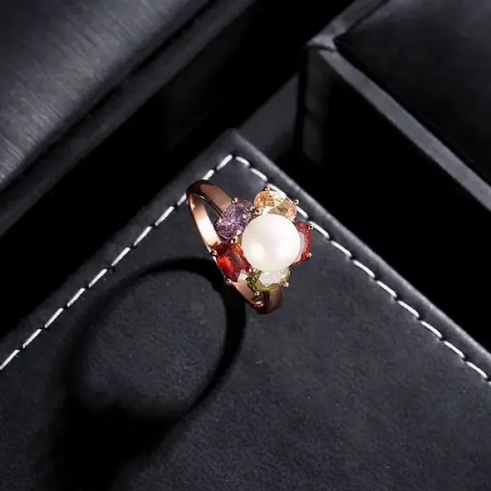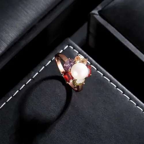 Бижутерное кольцо из сплава с позолотой, вставками из фианитов и искусственного жемчуга.