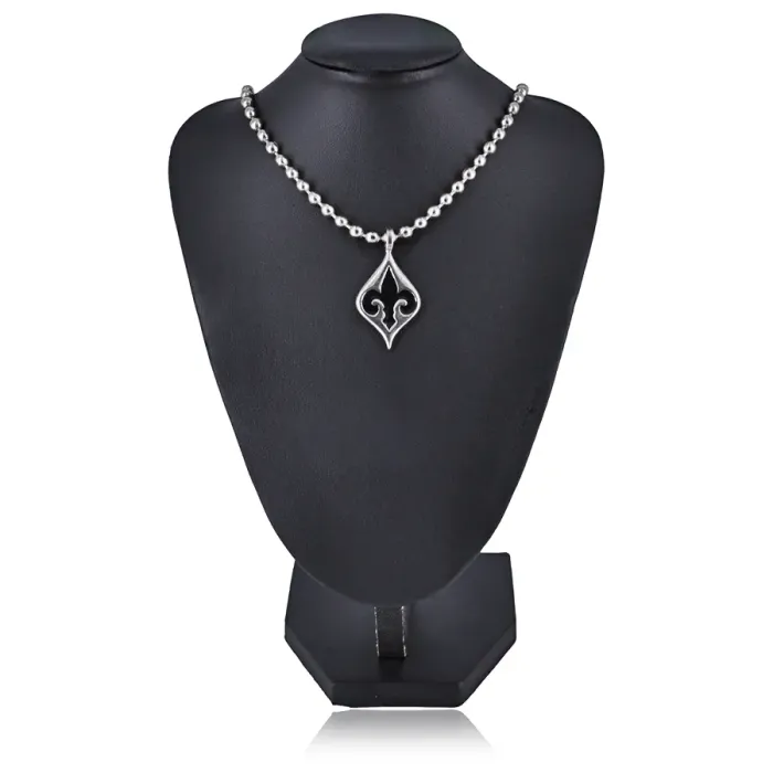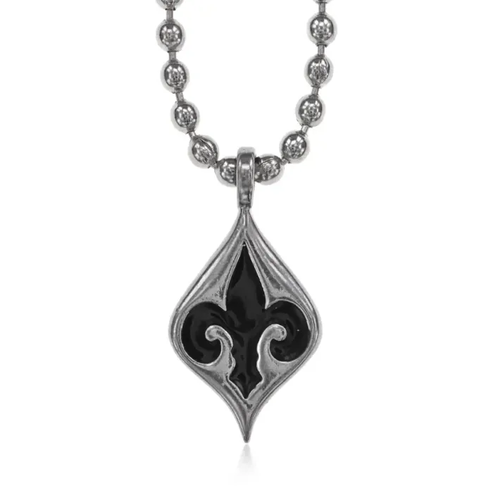 Амулет в форме карточной масти пика на шариковой цепочке. Изготовлен из металла с покрытием под серебро и эмалью.