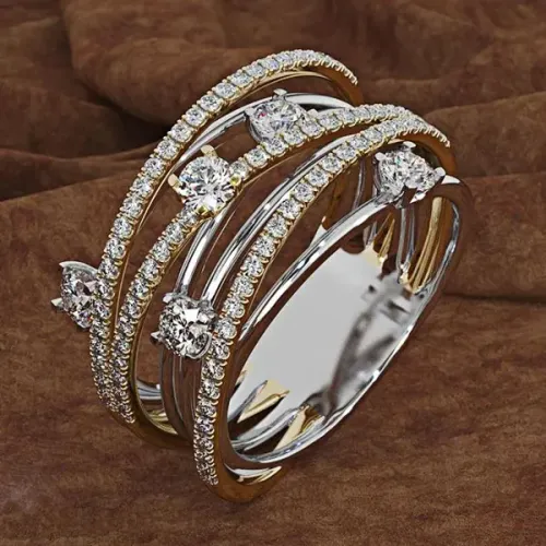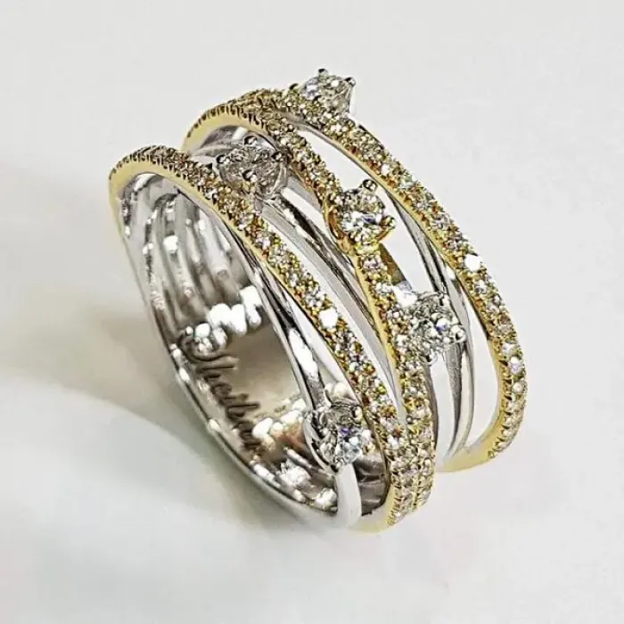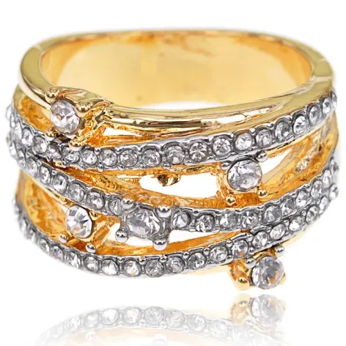 Кольцо из бижутерного сплава с позолотой и вставками из фианитов и стразов.