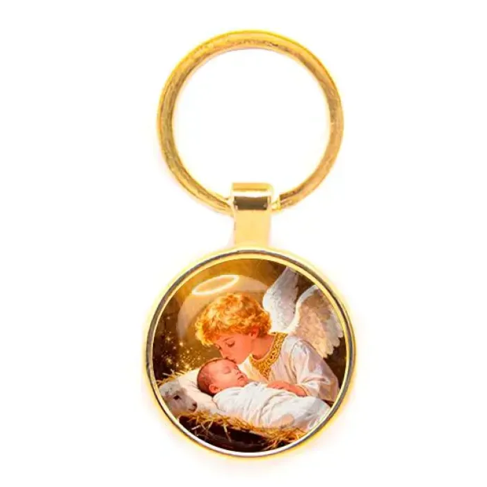 Круглый брелок с изображением Младенца Иисуса и ангела — это не просто аксессуар, а символ веры и надежды. Изготовленный из бижутерного сплава с покрытием под золото и стекла, он станет прекрасным подарком для близких или элементом личной коллекции. Размер брелка с кольцом составляет 28х60 мм, а изображение защищено выпуклой стеклянной линзой, что придаёт ему дополнительную выразительность.