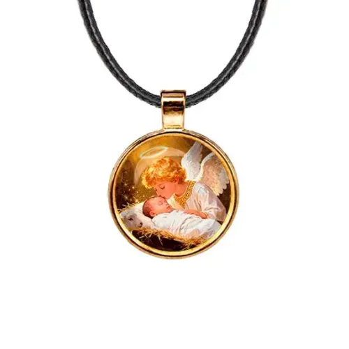 Этот изысканный кулон с изображением Младенца Иисуса и ангела станет не только стильным аксессуаром, но и символом веры. Изготовленный из бижутерного сплава с покрытием под золото и стекла, он сочетает в себе красоту и духовное значение.