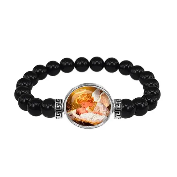 Стрейч-браслет из натурального камня Чёрный агат диаметром 8 мм — это стильное украшение с глубоким символизмом. Изображение Младенца Иисуса и ангела, расположенное под выпуклой стеклянной линзой, привносит в аксессуар особую духовную атмосферу. Сеттинг выполнен из бижутерного сплава с покрытием под серебро, что придаёт изделию элегантный вид. Диаметр изображения составляет 20 мм, что делает его заметным акцентом на браслете. Такой аксессуар станет прекрасным подарком для тех, кто ценит уникальные изделия с культурным смыслом.