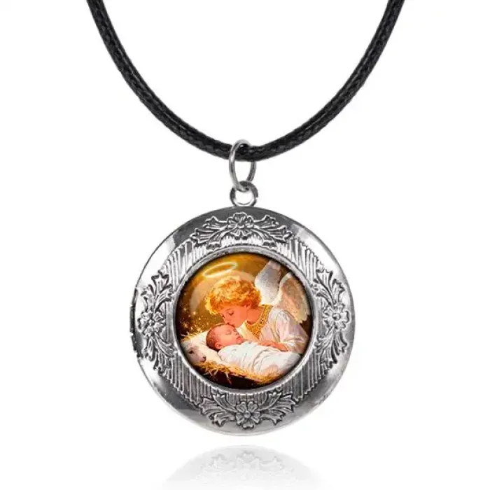 Арома-кулон металлический с изображением Младенца Иисуса и ангела создаёт атмосферу умиротворения и духовности. Изготовленный из бижутерного сплава под серебро, он станет стильным аксессуаром для повседневной носки или особых случаев. Размер кулона составляет 36х33 мм, а изображение защищено выпуклой стеклянной линзой диаметром 20 мм. В комплект входит шнурок с застёжкой и впитывающий шарик, что позволяет наслаждаться любимыми ароматами в любое время. Этот кулон может стать отличным подарком или элементом для создания уюта в доме.