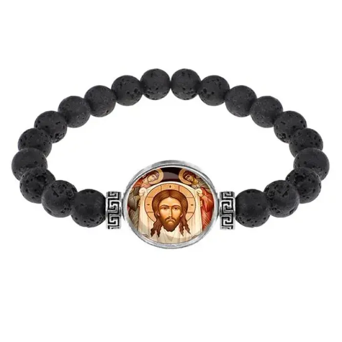 Стрейч-браслет из натуральной лавы диаметром 8 мм с изображением под выпуклой стеклянной линзой. Внутренний диаметр составляет около 5,5 см. Изготовлен из лавы, бижутерного сплава с покрытием под серебро и стекла. Натуральный камень лава ценится за свою способность впитывать эфирные масла, что делает его идеальным для аромабижутерии. Нанесение нескольких капель эфирного масла на бусины позволяет создавать уникальные ароматические композиции и наслаждаться их благоприятным воздействием.