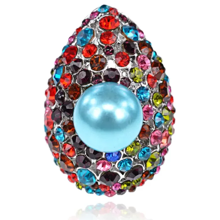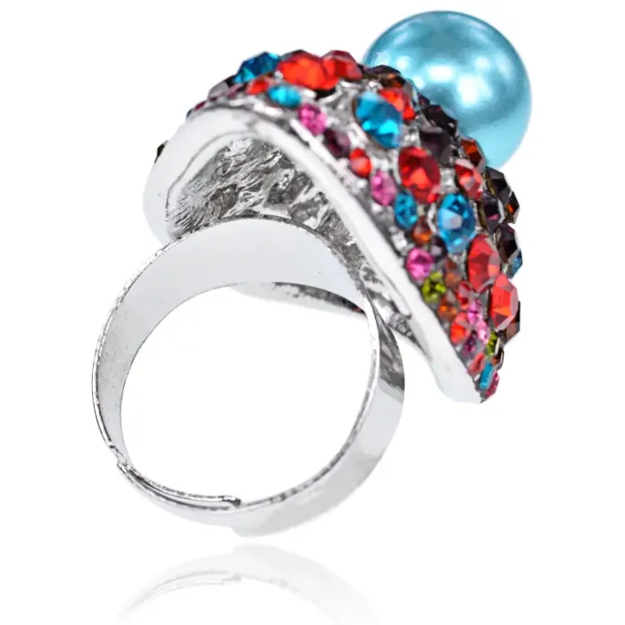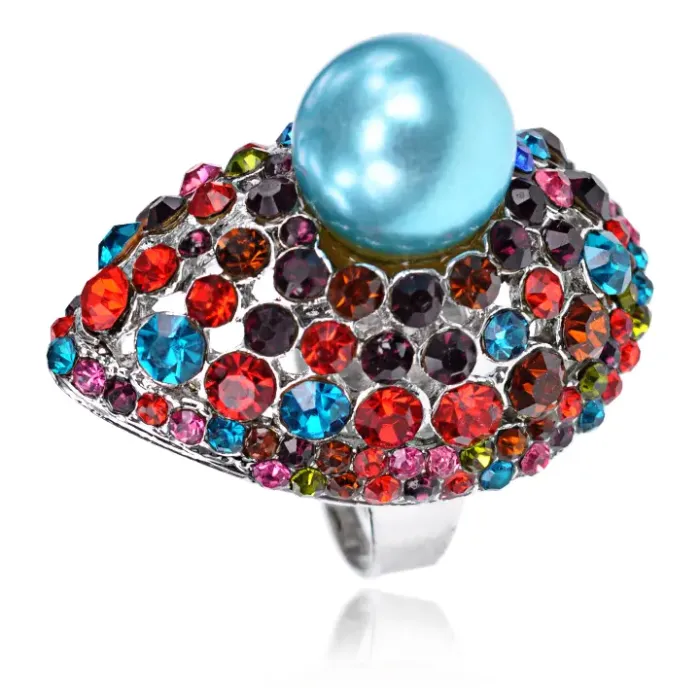 Бижутерное кольцо открытой формы с регулируемым размером, украшенное стразами и искусственным жемчугом.