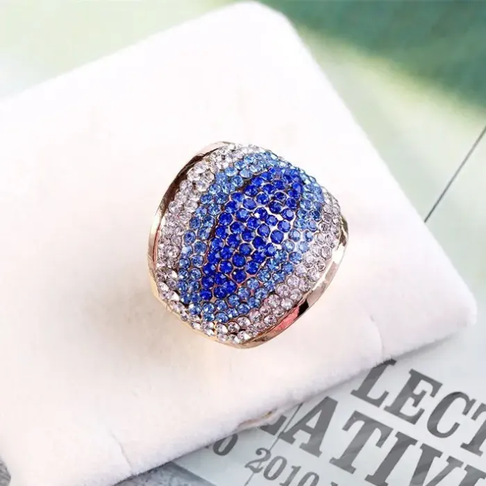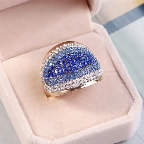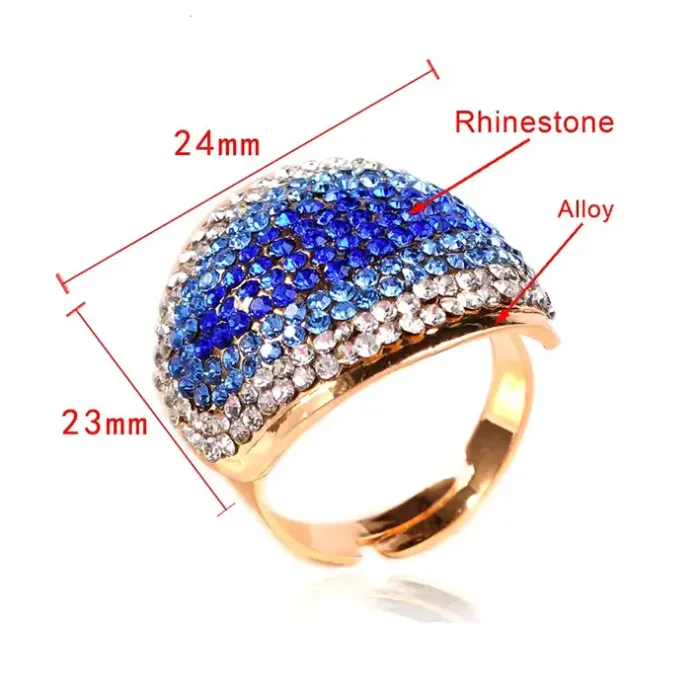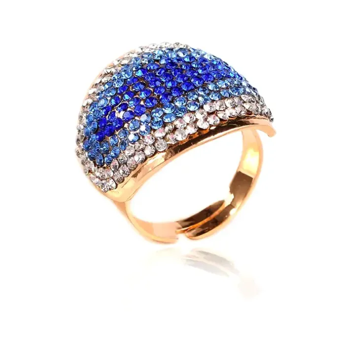 Безразмерное кольцо из бижутерного сплава с дизайном в виде глаза и синими стразами.