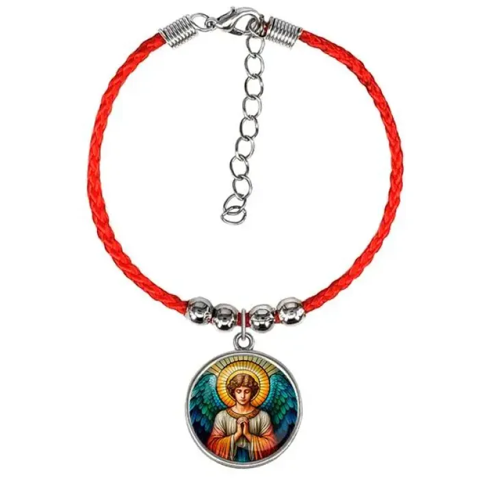 Браслет из яркого и прочного шнурка с изображением Ангела хранителя, защищённым выпуклым стеклом на металлической основе. Этот аксессуар не только стильный, но и символический — традиционно считается оберегом, который приносит удачу и защиту своему владельцу. Максимальный диаметр браслета составляет 7,5 см и легко регулируется под размер запястья. Изготовлен из качественного шнура и бижутерного сплава с покрытием под серебро, что обеспечивает долговечность изделия. Диаметр изображения составляет 20 мм, что делает его заметным акцентом в любом образе.