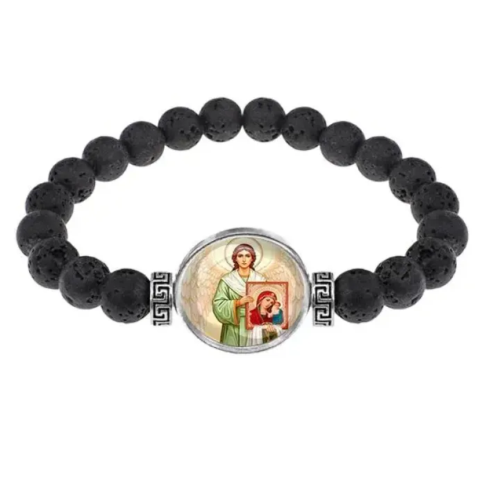 Стрейч-браслет из натуральной лавы диаметром 8 мм с изображением ангела под выпуклой стеклянной линзой. Внутренний диаметр составляет примерно 5,5 см. Изготовлен из качественных материалов: лавы, бижутерного сплава с покрытием под серебро и стекла.