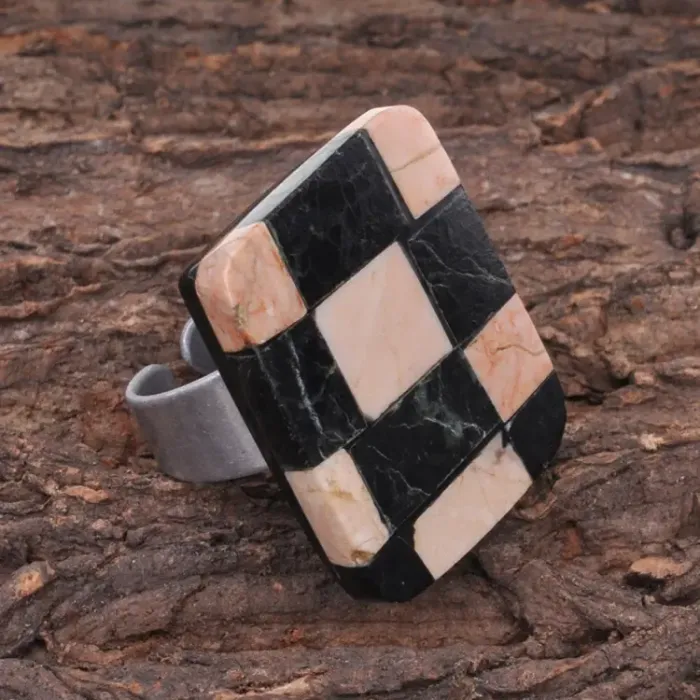 Безразмерное кольцо с дизайном в шахматной тематике. Материал — металл с покрытием под серебро и пластик.