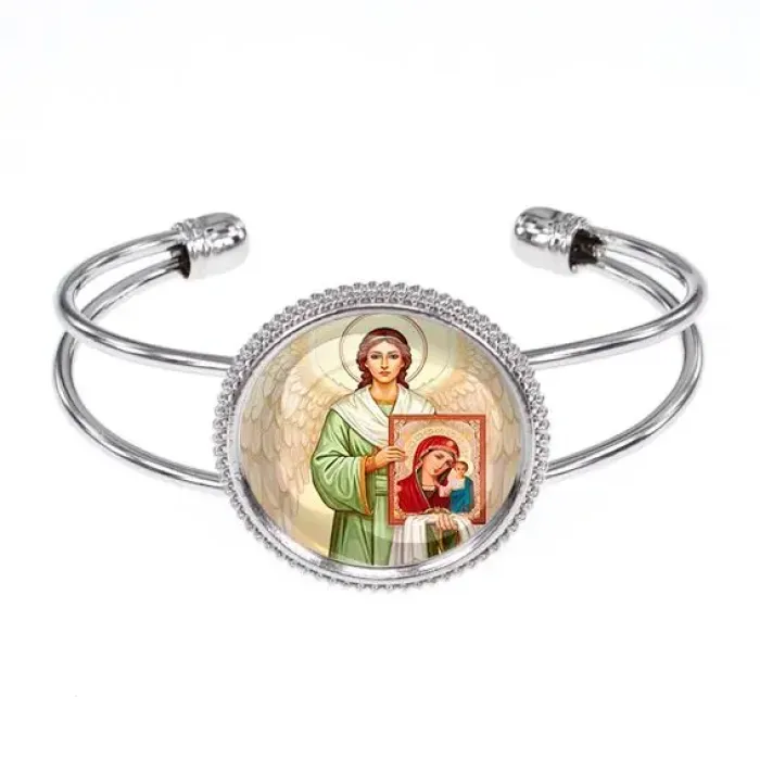 Браслет из бижутерного сплава с изображением ангела и иконы под выпуклой стеклянной линзой. Этот стильный аксессуар станет не только модным дополнением, но и символом защиты. Размер браслета безразмерный, что позволяет легко адаптировать его к любой руке. Изготовлен из бижутерного сплава с покрытием под серебро и стекла, он сочетает в себе прочность и элегантность. Такой браслет может стать прекрасным подарком для близкого человека или украшением для себя.