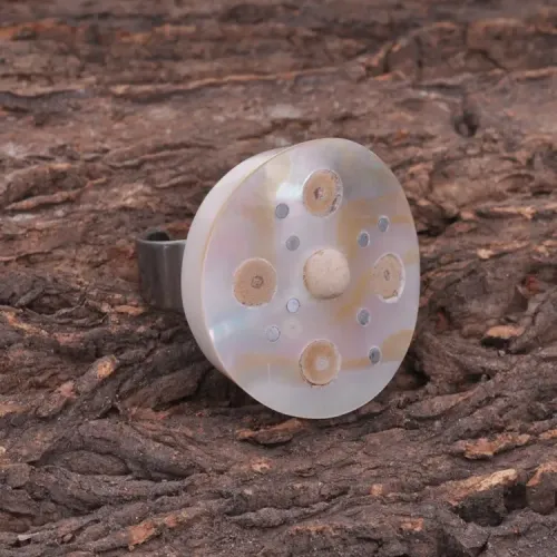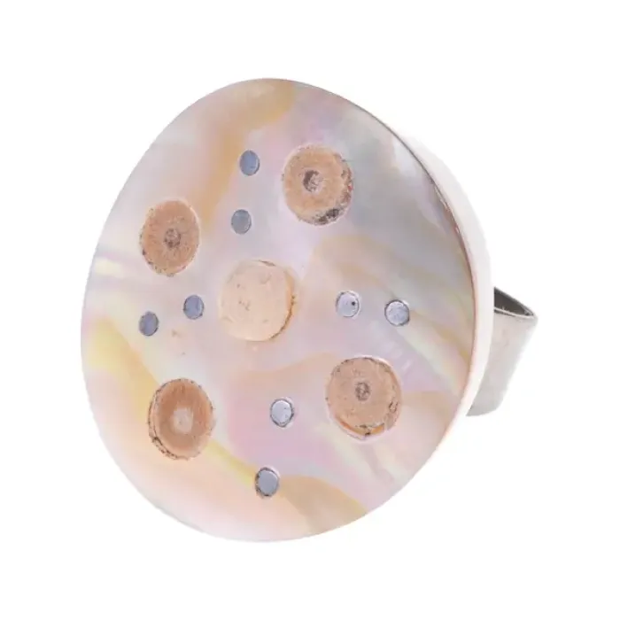 Безразмерное кольцо с перламутром, металлическое с покрытием под серебро.