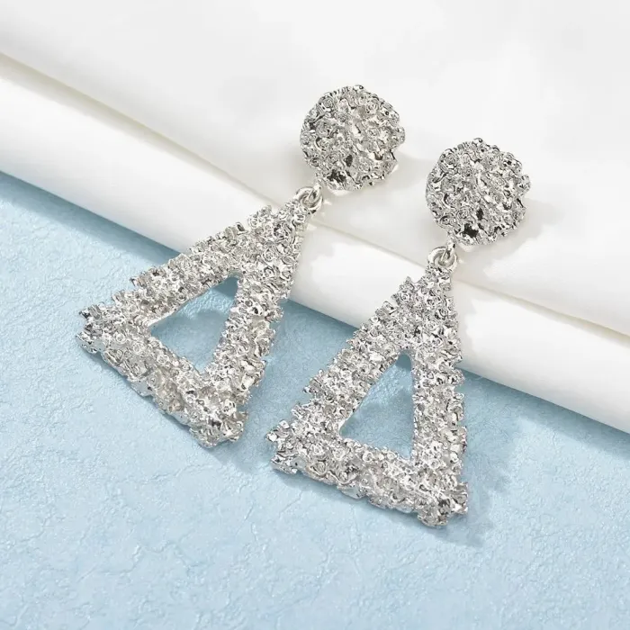 Серьги в форме треугольника из бижутерного сплава с серебряным покрытием. Замок типа пусет.