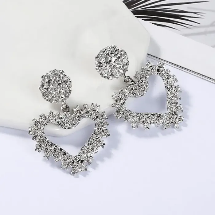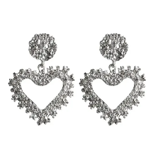 Эти изысканные серьги в форме сердца станут прекрасным дополнением любого образа. Изготовленные из бижутерного сплава и покрытые слоем под серебро, они придают элегантность и стиль. Тип замка — пусет (гвоздик) обеспечивает надежную фиксацию на ухе. Размеры: высота — 50 мм, ширина — 35 мм, глубина — 10 мм делают их заметными, но не громоздкими. Серьги идеально подходят для подарка или как акцент к повседневному наряду.