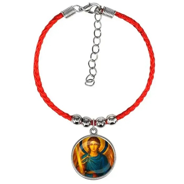 Браслет из красного шнура — это стильный аксессуар с глубоким символическим значением. Изображение Архангела Михаила, защищенное выпуклым стеклом, располагается на прочной металлической основе. Этот браслет не только привлекает внимание своим ярким дизайном, но и служит оберегом для своего обладателя.