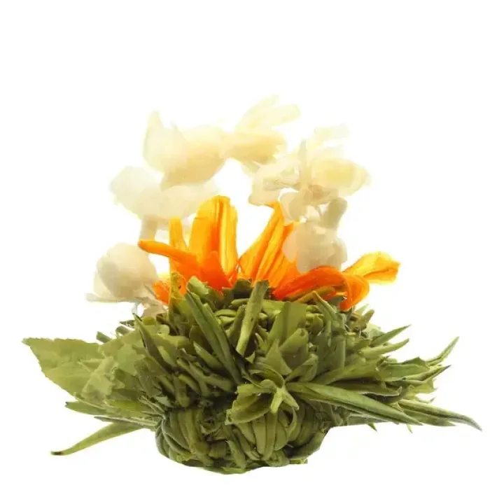 Китайский связанный чай Бай Хуа Сян Цзы (Лунный сад жасминовый) обладает утонченным травяным вкусом благодаря добавлению бутонов жасмина и тигровой лилии. При заваривании листья чая распускаются, высвобождая ароматы цветов, трав и фруктов. Настой имеет полупрозрачный золотистый оттенок с зелеными переливами. Аромат этого напитка завораживает настоящих ценителей чая.