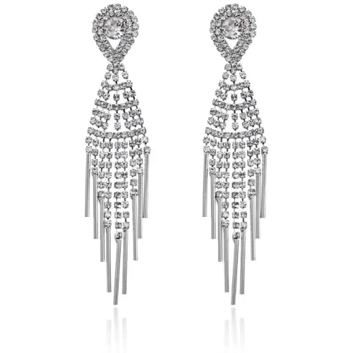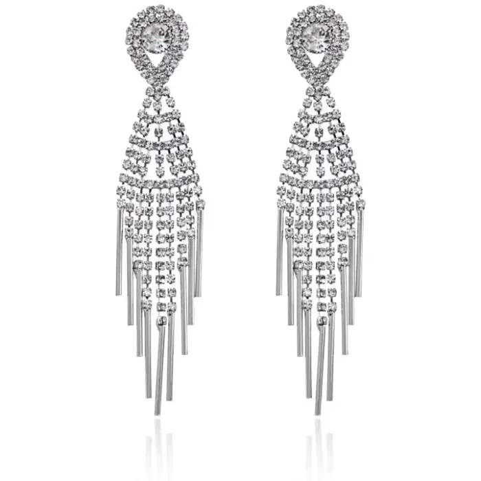 Серьги из бижутерного сплава с покрытием под серебро и вставками из кристаллов. Тип замка — пусет.