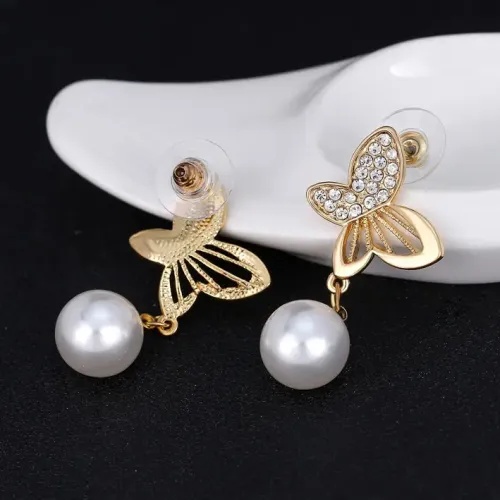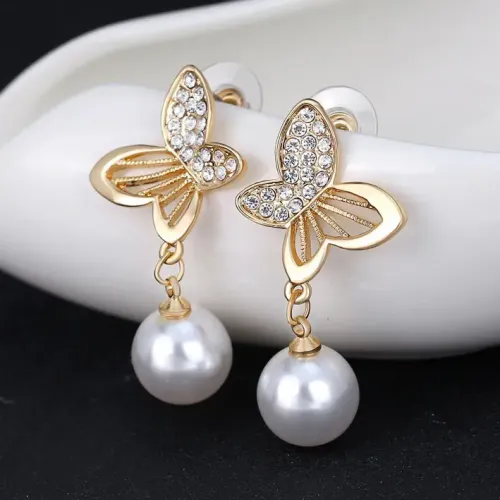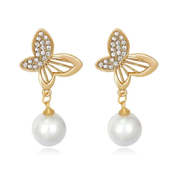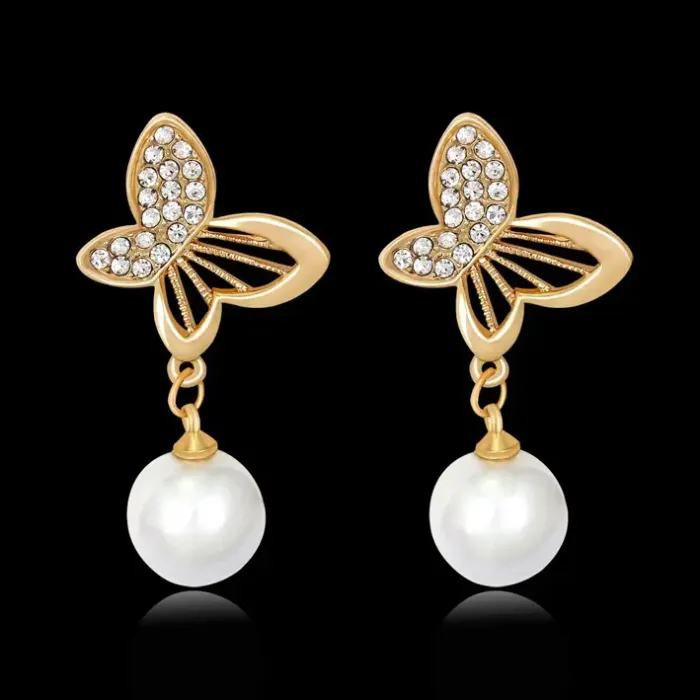 Серьги-пусеты в виде бабочек с вставками из фианитов и искусственного жемчуга.