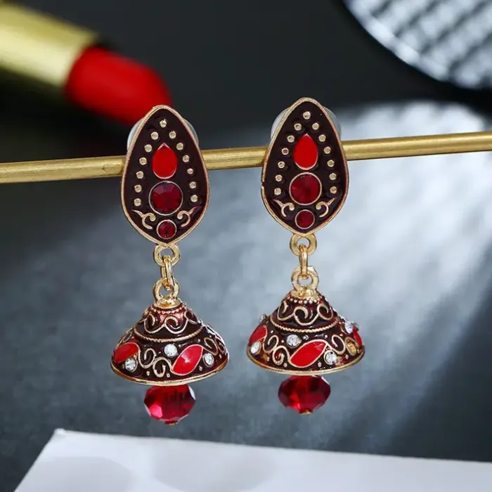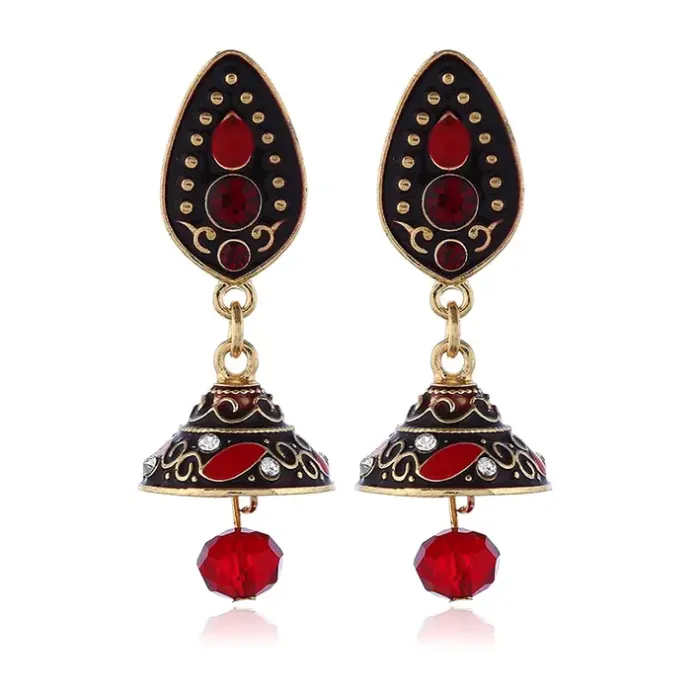 Серьги-пусеты в форме колокольчика красного цвета из бижутерного сплава с декоративными элементами.