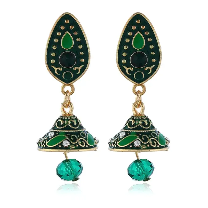 Серьги-пусеты в форме колокольчика зелёного цвета с инкрустацией.