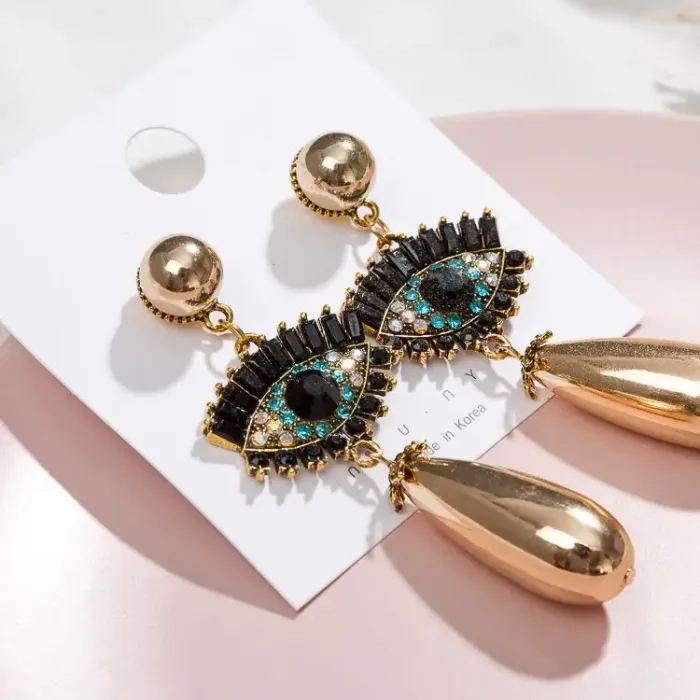 Серьги-пусеты в форме глаза из бижутерного сплава с золотым покрытием и стразами.