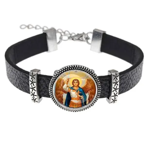 Браслет из кожи с изображением Архангела Михаила под выпуклой стеклянной линзой — это не только стильный аксессуар, но и символ защиты и силы. Изображение диаметром 20 мм придаёт изделию уникальность и глубину. Регулируемый размер позволяет удобно носить браслет на любой руке, а материалы — искусственная кожа и бижутерный сплав с покрытием под серебро — обеспечивают долговечность и комфорт в использовании. Стекло добавляет блеска, делая этот аксессуар идеальным дополнением к любому образу. Браслеты с изображениями святых традиционно ценятся за их духовное значение и могут стать прекрасным подарком для близких.