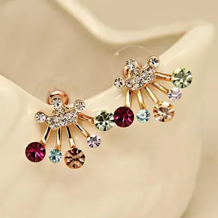 Серьги-гвоздики в форме короны со стразами из бижутерного сплава с покрытием под золото.