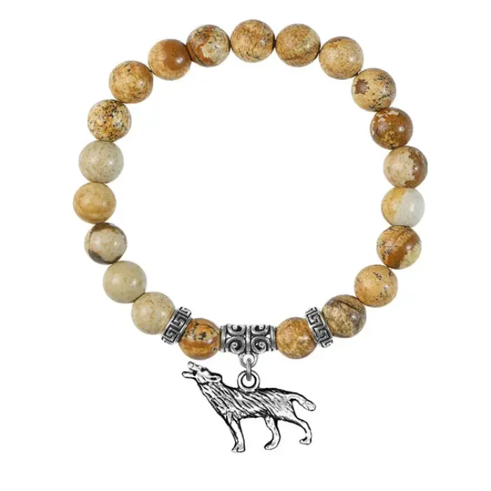 Браслет из натуральной песочной яшмы с подвеской-талисманом в виде волка из бижутерного сплава.