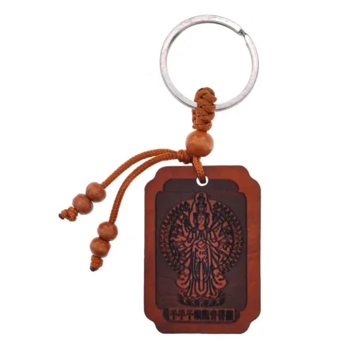 Брелок с изображением Гуаньинь из красного дерева и металла с лазерной гравировкой.