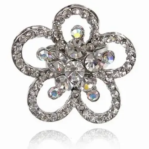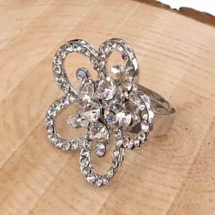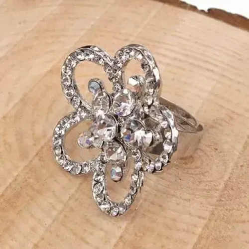Безразмерное кольцо из бижутерного сплава в серебряном цвете с дизайном в виде цветка и вставками из страз.