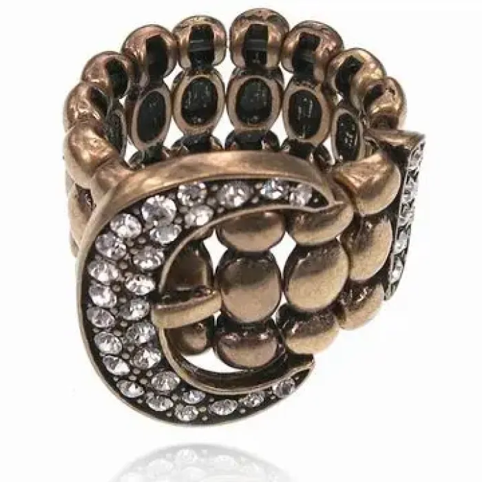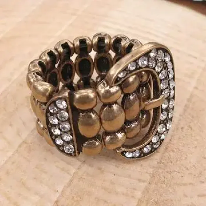 Безразмерное стрейч-кольцо из бижутерного сплава с дизайном в виде пряжки и блестящими вставками.