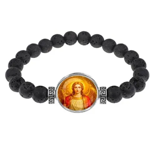 Стрейч-браслет из натуральной лавы диаметром 8 мм с изображением Архангела Михаила под выпуклой стеклянной линзой. Внутренний диаметр составляет около 5,5 см. Изготовлен из качественных материалов: лавы, бижутерного сплава с покрытием под серебро и стекла. Лава традиционно используется в аромабижутерии благодаря своей способности впитывать эфирные масла. Для активации аромабраслета достаточно нанести несколько капель масла на бусины, что позволяет создавать уникальные ароматические композиции. Этот браслет станет не только стильным аксессуаром, но и источником приятных ароматов в повседневной жизни.