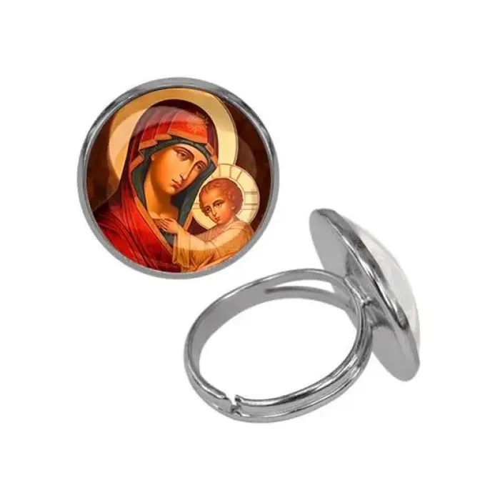 Это безразмерное кольцо из бижутерного сплава с покрытием под серебро и изображением Богородицы с Иисусом. Оно украшено выпуклой стеклянной линзой диаметром 20 мм, что придаёт изделию особую выразительность и глубину. Кольцо станет прекрасным символическим подарком для близких или элементом личной коллекции. В народе такие украшения ценятся за их духовный смысл и эстетическую привлекательность. Это изделие идеально подходит для повседневного ношения или особых случаев.