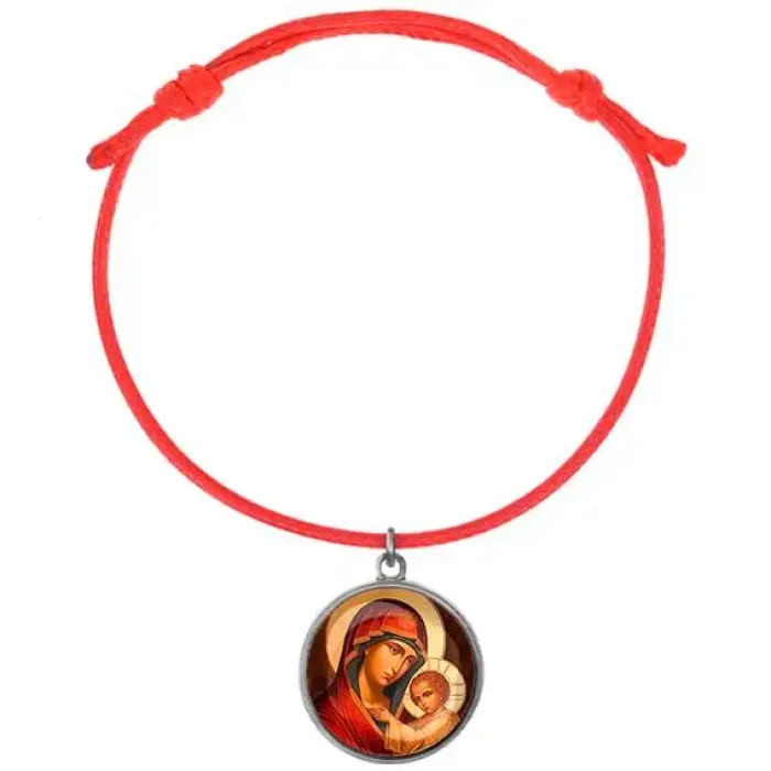 Этот браслет из красного шнура — символ веры и защиты. Он украшен подвеской с изображением Богородицы и Иисуса, выполненной из металлического основания с полиграфической вставкой под выпуклым стеклом. Диаметр изображения составляет 20 мм, что делает его заметным элементом в любом образе.
