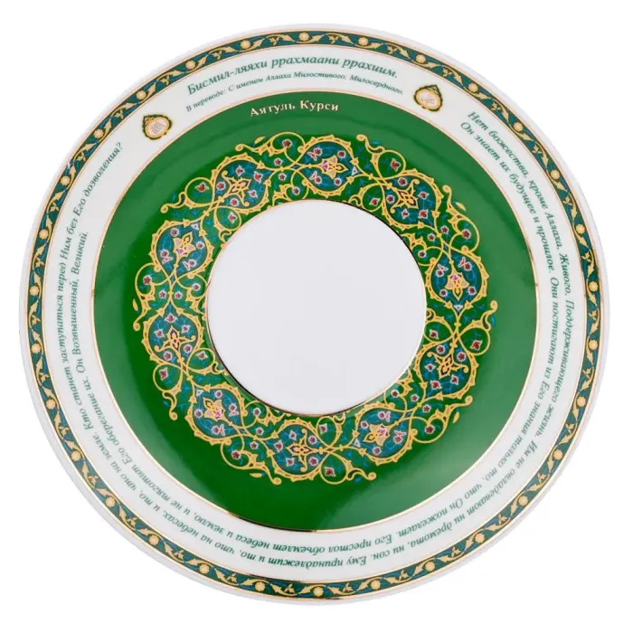 Пара изготовлена из высококачественного тонкостенного фарфора, что обеспечивает долговечность изделия. Декоративные элементы включают отрывки сур из Корана на арабском и русском языках с золотой отделкой. Конструкция состоит из чашки и блюдца, предназначенных для сервировки.