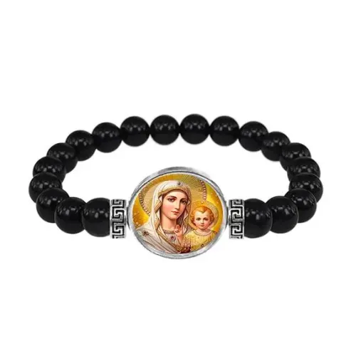 Стрейч-браслет из натурального камня Чёрный агат диаметром 8 мм — это не только стильный аксессуар, но и символ духовной связи. Изображение Богородицы с Иисусом диаметром 20 мм расположено под выпуклой стеклянной линзой на сеттинге из бижутерного сплава с покрытием под серебро. Такой браслет может стать прекрасным подарком для близких или украсить личную коллекцию сувениров.