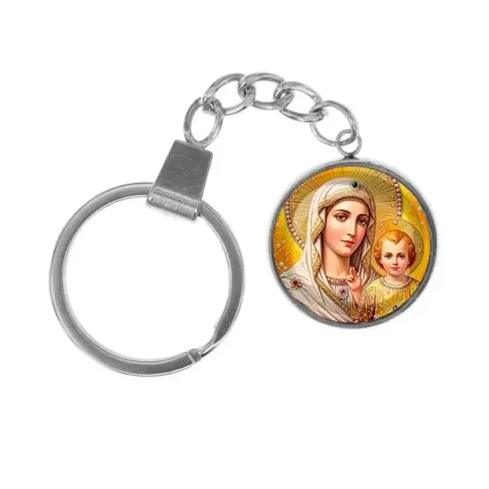 Брелок из нержавеющей стали — это не только стильный аксессуар, но и символ веры. Изображение Богородицы с Иисусом под стеклянной линзой придаёт этому кулону особую значимость.