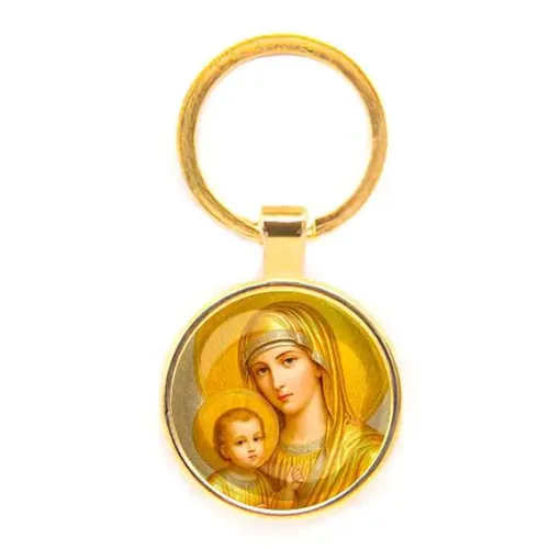 Круглый брелок с изображением Богородицы и Иисуса — это не только стильный аксессуар, но и символ веры и духовности. Изготовленный из бижутерного сплава с покрытием под золото, он станет прекрасным дополнением к ключам или сумке. Особенностью данного изделия является защитное стекло, которое придаёт яркость изображению и защищает его от повреждений.