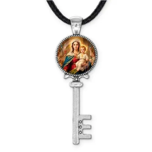 Кулон в форме ключа — это не только стильное украшение, но и символ веры. Изображение Богородицы с Иисусом обрамлено защитной выпуклой стеклянной линзой, что придаёт ему особую значимость.
