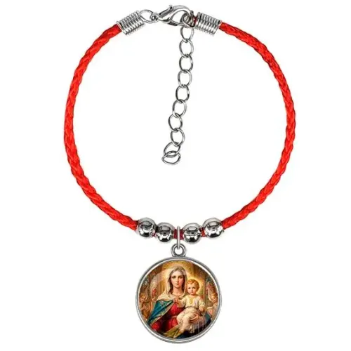 Браслет из красного шнура — это не только стильный аксессуар, но и символ веры. Изображение Богородицы с Иисусом, защищенное выпуклым стеклом на металлической основе, придает изделию особую значимость.