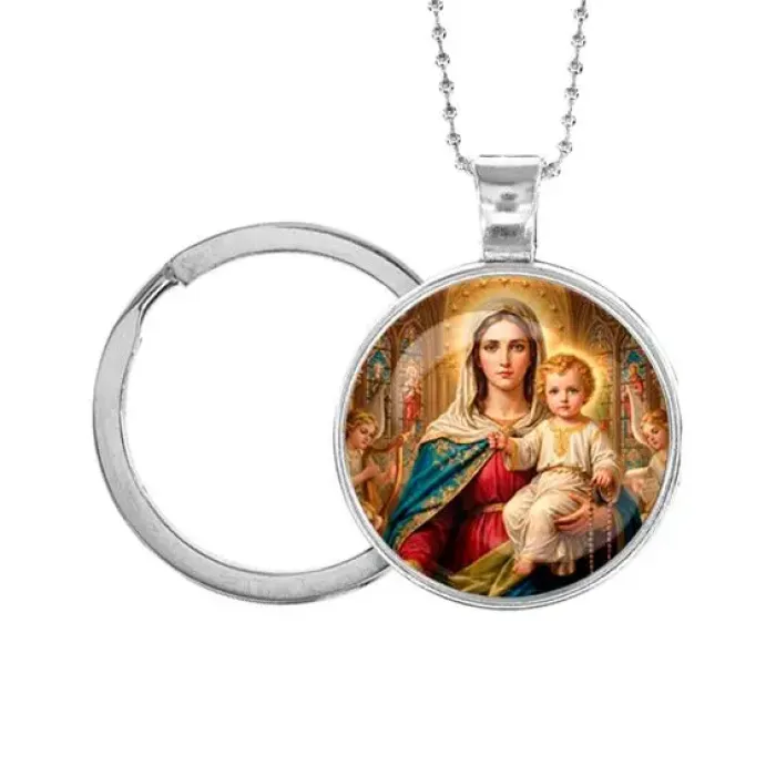 Кулон-брелок с изображением Богородицы и Иисуса — символ веры и защиты. Этот изысканный аксессуар выполнен из бижутерного сплава с покрытием под серебро и дополнен стеклянной линзой, которая защищает изображение. Основные особенности: