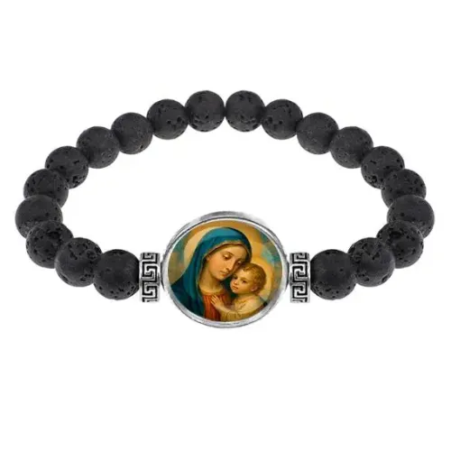 Стрейч-браслет из натуральной лавы диаметром 8 мм с изображением под выпуклой стеклянной линзой. Внутренний диаметр составляет около 5,5 см. Изготовлен из лавы, бижутерного сплава с покрытием под серебро и стекла. Лава традиционно используется в аромабижутерии благодаря своей способности впитывать эфирные масла. Для активации аромабраслета достаточно нанести несколько капель эфирного масла на бусины, что позволяет создавать уникальные ароматические композиции.