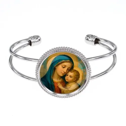 Элегантный браслет из бижутерного сплава с изображением Богородицы и Иисуса под выпуклой стеклянной линзой. Этот безразмерный аксессуар станет не только стильным дополнением к образу, но и символом веры и защиты. Изготовлен из качественного бижутерного сплава с покрытием под серебро, что придаёт ему особую привлекательность и долговечность. Диаметр изображения составляет 25 мм, что позволяет акцентировать внимание на детали. Браслет идеально подходит для повседневной носки или в качестве подарка близким.