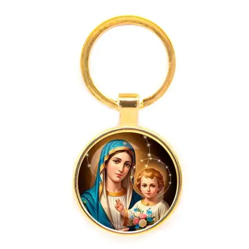 Круглый брелок с изображением Богородицы и Иисуса — это не только стильный аксессуар, но и символ веры. Он выполнен из бижутерного сплава с покрытием под золото и дополнен защитной выпуклой стеклянной линзой, что придаёт ему особую привлекательность. Размер брелка вместе с кольцом составляет 28х60 мм, что делает его удобным для ношения на ключах или сумке.
