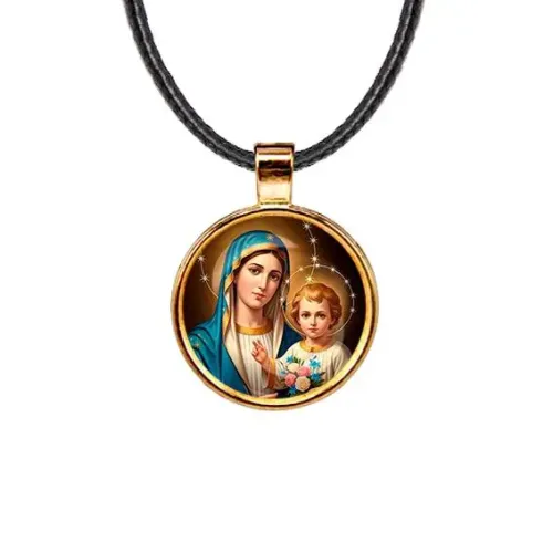 Кулон «Богородица с Иисусом» — это изысканное украшение, которое сочетает в себе духовный символизм и элегантность. Он выполнен из бижутерного сплава с покрытием под золото и дополнен стеклянной линзой, защищающей изображение. Основные особенности включают: