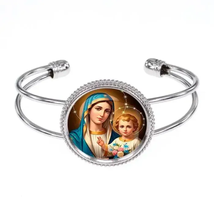Элегантный браслет из бижутерного сплава с изображением Богородицы и Иисуса, заключенным под выпуклой стеклянной линзой. Этот аксессуар не только украшает, но и символизирует духовную связь и защиту. Размер браслета безразмерный, что делает его универсальным для любого запястья. Изготовлен из высококачественного бижутерного сплава с покрытием под серебро, что придаёт ему особый блеск и долговечность. Такой браслет станет прекрасным подарком или дополнением к любому образу.