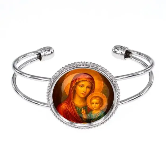 Браслет из бижутерного сплава — это не только стильный аксессуар, но и символ веры. Изображение Матери Божьей с Иисусом под выпуклой стеклянной линзой диаметром 25 мм придаёт изделию особую значимость. Безразмерный дизайн позволяет носить его на любой руке, а покрытие под серебро добавляет элегантности. Такой браслет станет прекрасным подарком для близких или украшением для себя в повседневной жизни. Традиционно подобные изделия ценятся за их духовную силу и поддержку в трудные времена.