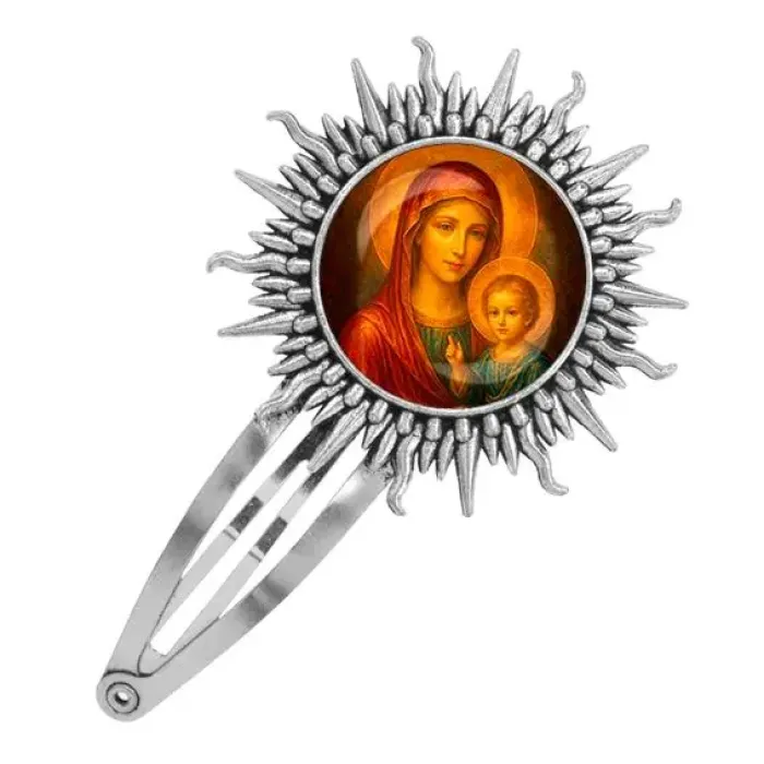 Эта изысканная заколка станет не только стильным аксессуаром, но и символом веры. Изображение Матери Божьей с Иисусом выполнено на основе бижутерного сплава с покрытием под серебро и защищено выпуклой стеклянной линзой. Размер заколки составляет 77 x 45 мм, что делает её удобной для повседневного использования или особых случаев.